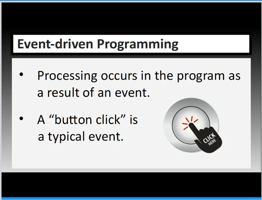 A mouse click Coding tasks involved in making your app respond to events by triggering functions. 3 var c 10. B Event-driven programs often require fewer coded decisions than console applications.
